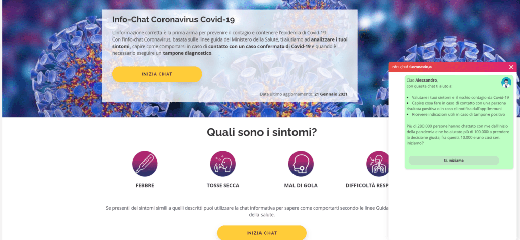 Il funzionamento del Chatbot Coronavirus è molto semplice: cliccando sull’icona “Info-chat Coronavirus” apparirà una schermata di dialogo e attraverso una serie di brevi domande, indagherà sui comportamenti considerati a rischio e gli eventuali sintomi manifesti. L’insieme delle risposte fornirà all’utente un parere sui possibili gradi di rischio (da nullo a sospetto contagio) e come sarà meglio agire per salvaguardare la propria salute.