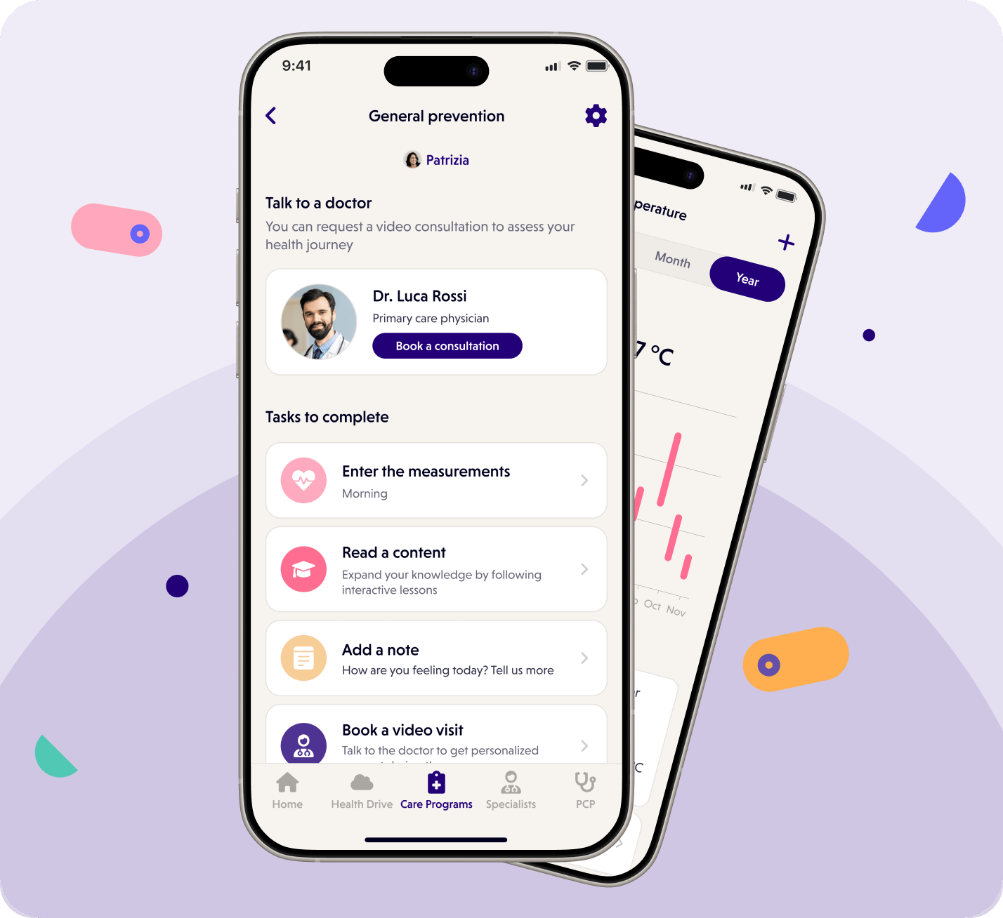 The Paginemediche app offers prevention and care programs that integrate digital technologies and medical services. Thanks to its connection with a vast library of medical devices, it provides a comprehensive experience adaptable to every need.